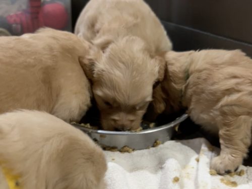 Jan 30th 2026: The whelping box is out of the pen and pups have potty boxes. They are loving their puppy started food.
