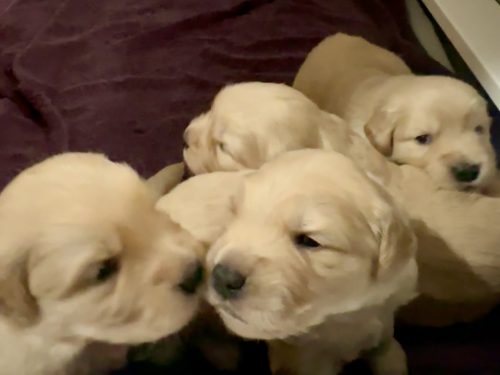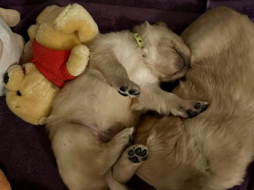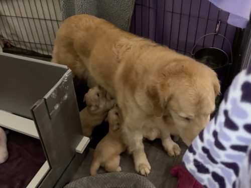 Jan 23rd 2026: Bridget still enjoying squishing into small spaces, but she can still fit the kids in for a feed (for now). Everyone got wormed again today & Robin is promising puppies something called “mash” tomorrow …. look for messy puppy pictures over the next few days!